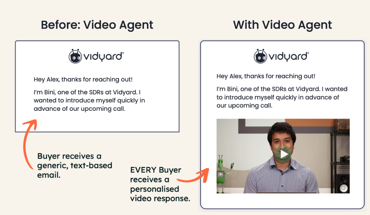 With Vidyard’s Video Agent, every workflow can deliver a video that feels relevant, personal, and engaging—automatically—so your team never misses a critical moment again.